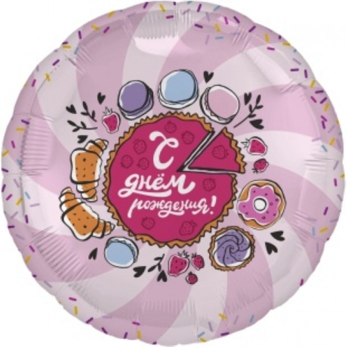 Шар (18''/46 см) Круг, С Днем Рождения! (тортик), Розовый, 1 шт.