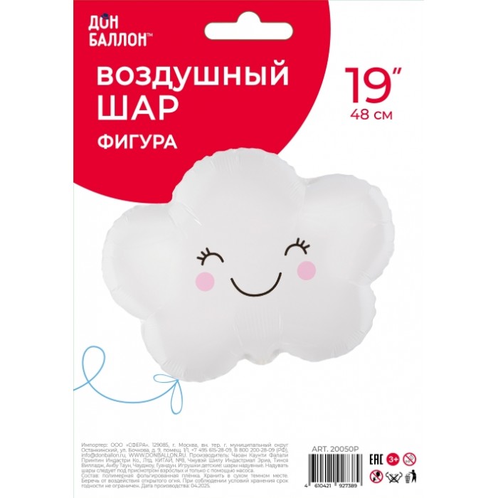 Шар (19''/48 см) Фигура, Счастливое облако, Белый, 1 шт. в уп.