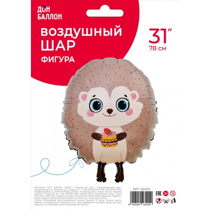 Шар (31''/79 см) Фигура, Ежик с кексиком, 1 шт. в уп.