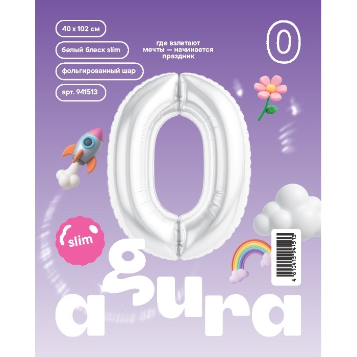 Шар (40''/102 см) Цифра, 0 Slim, Белый блеск, 1 шт. в уп.