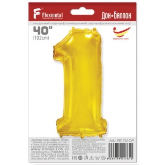 Шар (40''/102 см) Цифра, 1, Золото, 1 шт.