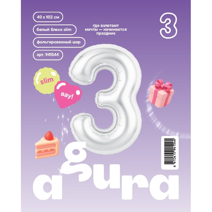 Шар (40''/102 см) Цифра, 3 Slim, Белый блеск, 1 шт. в уп.