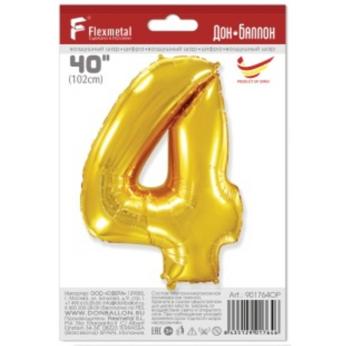 Шар (40''/102 см) Цифра, 4, Золото, 1 шт.