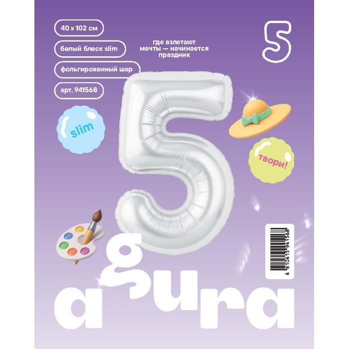 Шар (40''/102 см) Цифра, 5 Slim, Белый блеск, 1 шт. в уп.