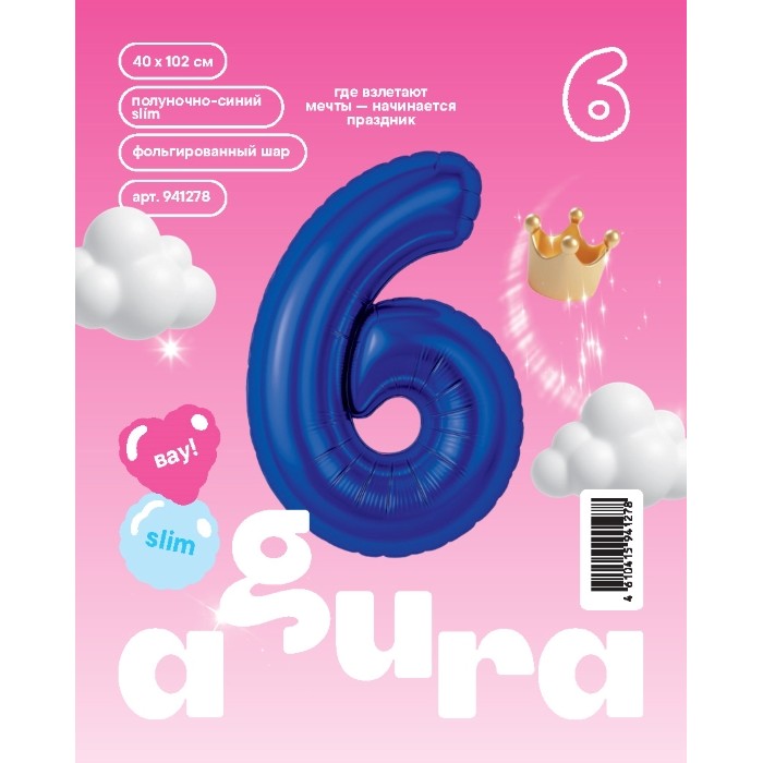 Шар (40''/102 см) Цифра, 6 Slim, Полуночно-синий, 1 шт. в уп.