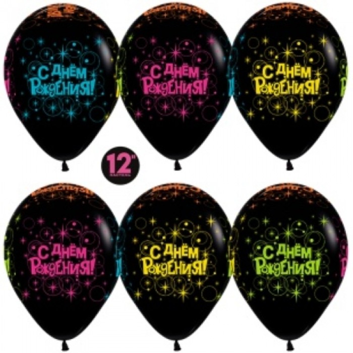 Шар (12''/30 см) С Днем Рождения! (разноцветные звезды), Черный (080), флуор, 5 ст, 25 шт.