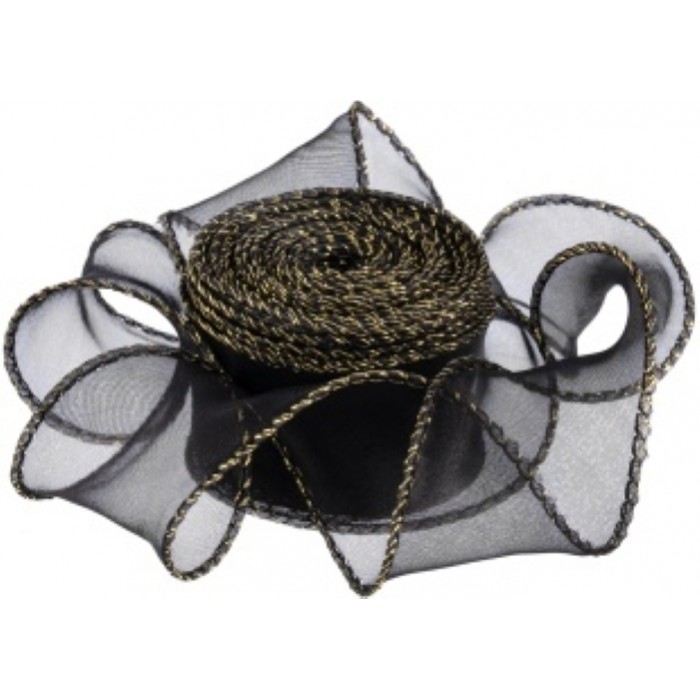 Лента декоративная (4 см*9,14 м) Органза с леской, Золотая кайма, Черный, 1 шт.