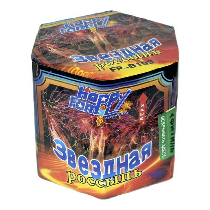 Звездная россыпь – батарея салютов из 37 залпов. Фейерверк обладает очень яркими взрывами и чистотой алого и оранжевого цвета. Перемежается золотыми взрывами с характерным треском. Пудрово-розовые хризантемы хорошо освещают все небо и далеко видны.