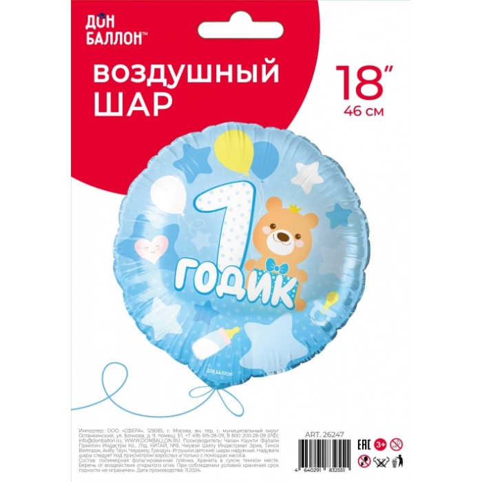 Шар (18''/46 см) Круг, 1 Годик малышу, Голубой, 1 шт. в уп.