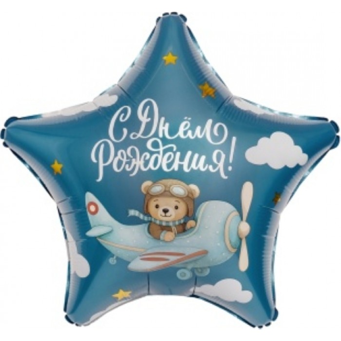 Шар (19''/48 см) Звезда, С Днем Рождения! (мишка-пилот), 1 шт.